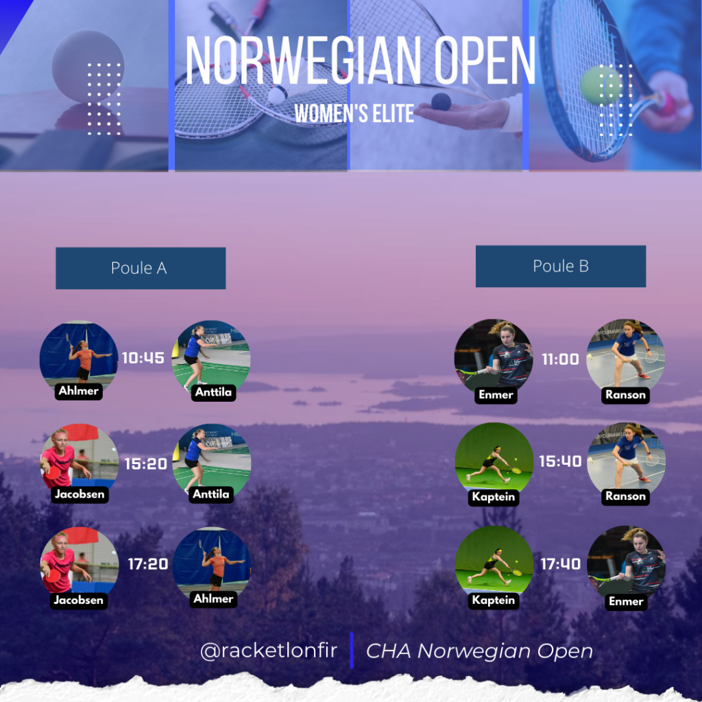 Group A kicked off with Ahlmer facing off against Anttila, with Ahlmer securing a decisive victory with a scoreline of +37 (21-5 21-10 21-11). The following match featured Jacobsen vs Anttila, resulting in Jacobsen taking the match +32 (21-11 21-5 21-15). The final match of the group pitted the world’s top two players against each other. In their previous encounter at the Finnish Open final, Jacobsen had emerged triumphant, and history repeated itself today. Although Ahlmer started strongly, Jacobsen steadily gained the upper hand in badminton and squash, ultimately prevailing with a score of +12 (11-21 21-9 21-10 9-10). She now faces Enmer in the final. Ahlmer and Kaptein will battle it out for the bronze medal tomorrow.